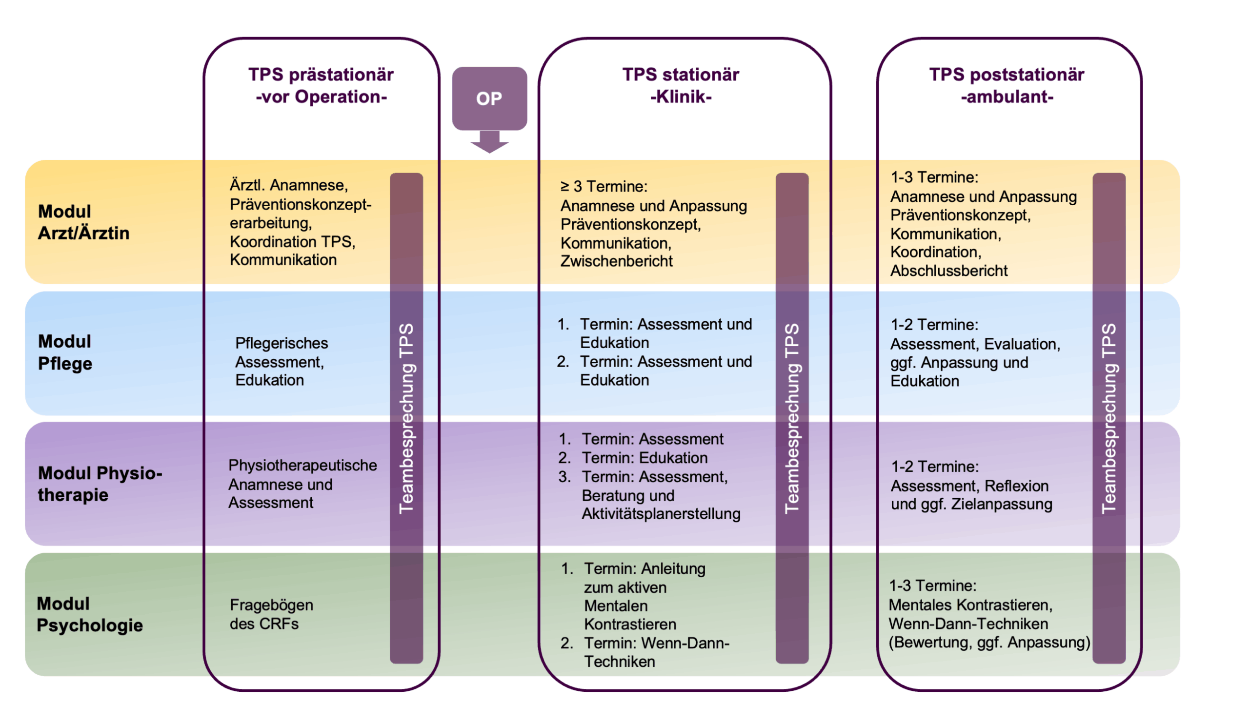 TPS ambulant/poststationär : Nach der Entlassung aus dem Krankenhaus werden die Patient*innen, die durch den TPS betreut werden, in der Durchführung einzelner Therapiemodule und in der Erreichung individueller Therapieziele unterstützt. Jede/r Patient*in wird mindestens einmal im Rahmen einer ambulanten Sprechstunde telefonisch kontaktiert und wenn möglich einbestellt, um die Therapie und Präventionsmaßnahmen bzw. Zielerreichung im Rahmen eines Gespräches mit der/dem Ärztin/Arzt, der Pflegefachperson, dem/der Physiotherapeuten/in sowie dem/der Psychologen/Psychologin zu kontrollieren bzw. falls notwendig zu optimieren. Sollten weitere ambulante Termine nötig sein, z.B. bei anhaltend starken Schmerzen oder weiteren Zeichen einer Schmerzchronifizierung, erfolgen diese bis zur endgültigen Entlassung aus der Betreuung des TPS bis zu sechs Monate nach der Operation durch den TPS. Zusätzlich steht der TPS bei schmerzmedizinischen Problemen in einer Telefonsprechstunde zu einer definierten Zeit zur Verfügung. Bei Anzeichen einer Chronifizierung 6 Monate nach OP kann dem weiterbehandelnden Arzt eine Empfehlung ausgesprochen werden, der/die Patient*in zeitnah – falls erforderlich – in eine Weiterbetreuung zu übermitteln.