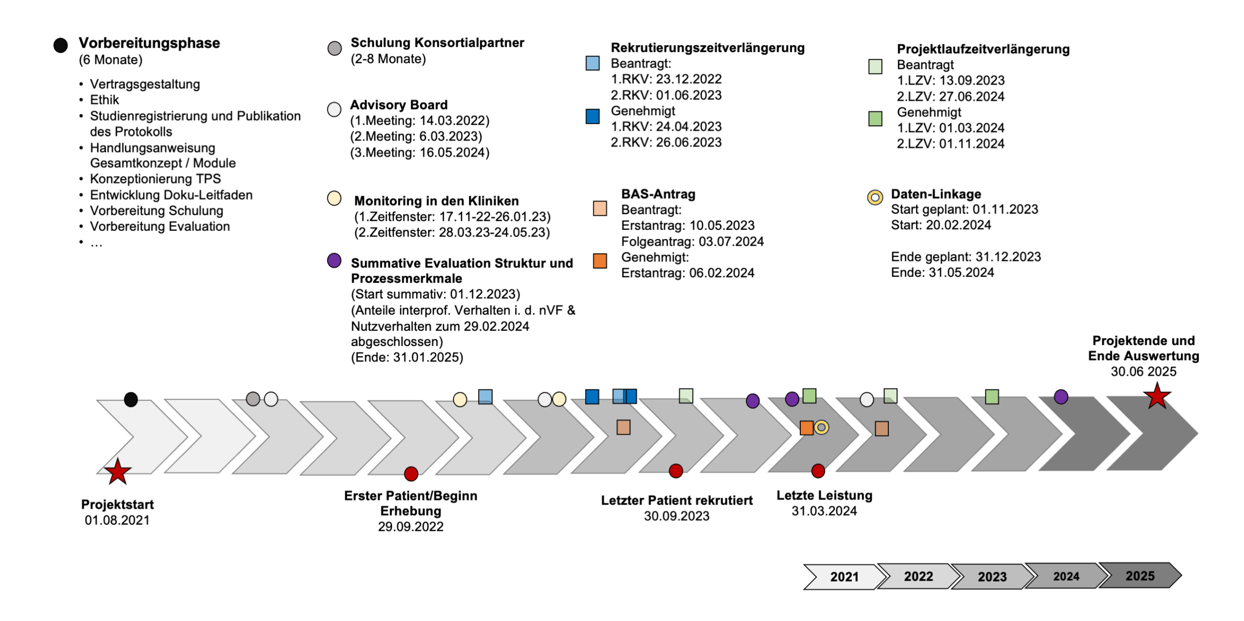 Das Projekt POET-Pain ist am 01.08.2021 gestartet und hatte eine geplante Projektdauer von 3 Jahren, wurde aber kostenneutral bis 30.Juni 2025 verlängert.. Nach Ende der Studienvorbereitungen wurden Patient*innen in 6 Universitätskliniken in die Studie eingeschlossen. Die Evaluation des Projektes erfolgt in einem externen und von der klinischen Erhebung unabhängigen Institut an der Universität Greifwald.
